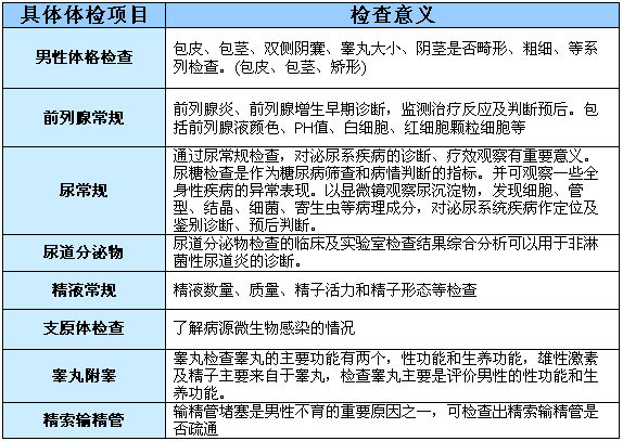 免费体检项目:前列腺常规、外生殖器检查、尿道分泌物检测、尿常规、精液检查、支原体、睾丸附睾、精索输精管