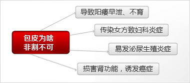 包皮内有丰富的皮脂腺,有大量的分泌物,包皮使分泌物不能排出而堆积成垢、寄生很多致病菌。病菌侵犯尿道可造成尿路感染,可引发包皮炎、龟头炎、尿道炎,还可增加生殖器疣病、疱疹等性疾病的感染几率。
