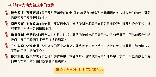 嘉兴的——嘉兴博爱指出:目前治疗包皮过长的前沿技术是由2010国际峰会、2011中国论坛推荐的学术新成果 ——中式纳米光动力包皮整形术,中韩光离子包皮精细手术采用领先高效的微创技术对男性生殖器进行“精雕细琢”,由于手术避开毛细血管网,术后外形自然美观,不留疤痕,无需拆线,让男性告别了以往手术痛苦、大量出血的“一刀切”,是目前国内男诊手术中先进、理想的治疗技术,以显著的技术优势博得了业内与众多患者的一致好评。推荐:包皮怎么样才算过长?