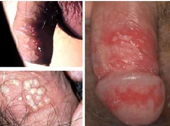 病史:患者自述2个月前陪客户洗桑那时,叫了小姐,一周左右包皮、龟头长有10余个小小而瘙痒的红丘疹,后变成小水疱、瘙痒、灼痛,尿道刺痛、尿急、尿频、淋漓不尽。曾自行用药(用药不详)治疗,为见效(用药不详)。