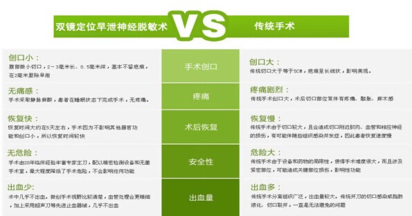 双镜定位早泄神经脱敏术是一种在高倍微创手术,其原理是借助高倍双镜定位,在高清视野下精确微控阻断敏感神经,手术采用2mm(毫米)小孔微创技术,确保实现切口小、出血少、恢复快等优势,其中接受双镜定位早泄神经脱敏术后的95.6%患者,可将性生活延长至15分钟以上(其中20%可延长至30分钟以上)。