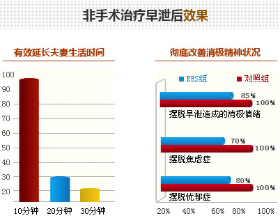 性生活恢复快,87.5%的患者可将性生活时间延长至20分钟以上,其中20%达到30分钟以上,10%的患者可以延长至15分钟以上,痊愈者自觉控制射精的能力大大加强,对术后性生活质量表示非常满意,自觉控制射精能力大大加强。