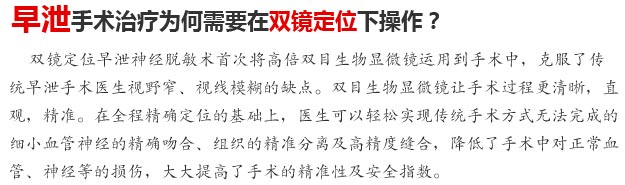 采用医学高倍双目生物显微镜精准定位阴茎背神经组织数量,并通过美国进口的BIO阴茎敏感神经检测仪快速找出敏感神经所在并确定阀值,运用微创技术精确定位需要“脱敏”的神经,为术后效果提供第一手临床数据,相比传统阴茎背神经手术,精确度更高、更安全。